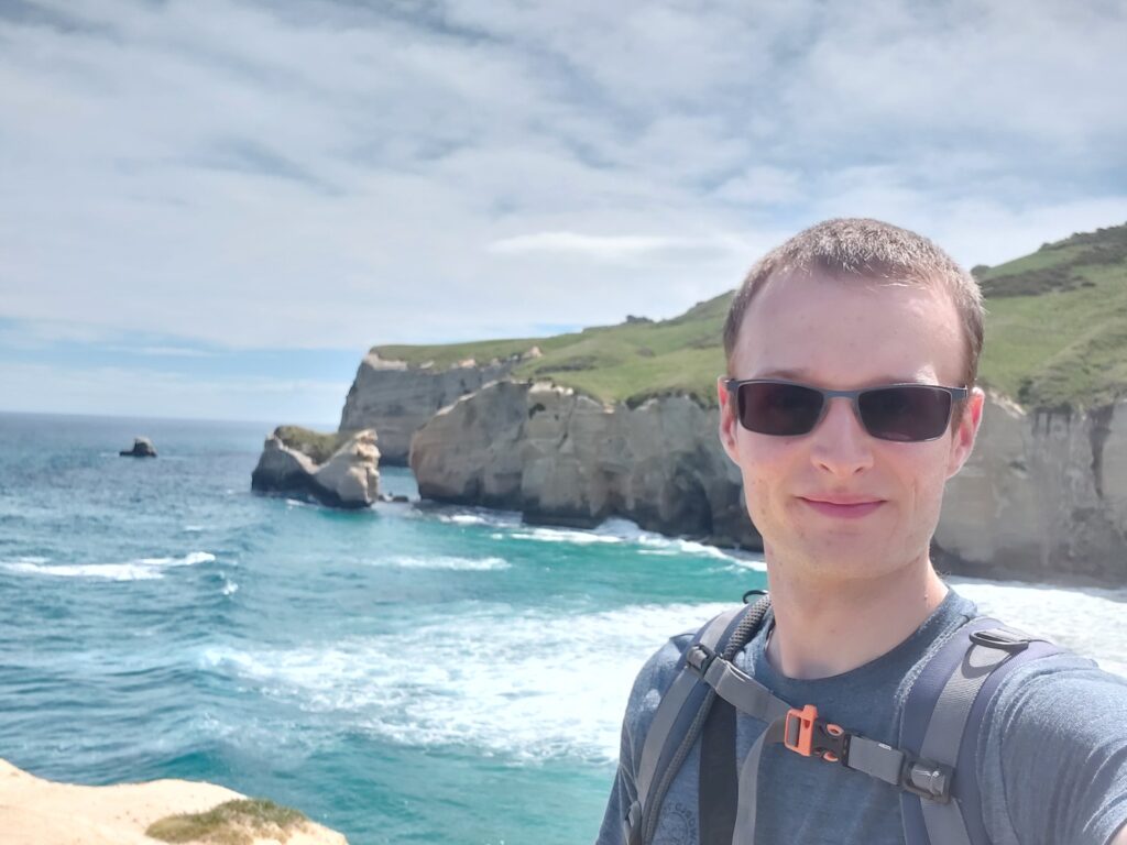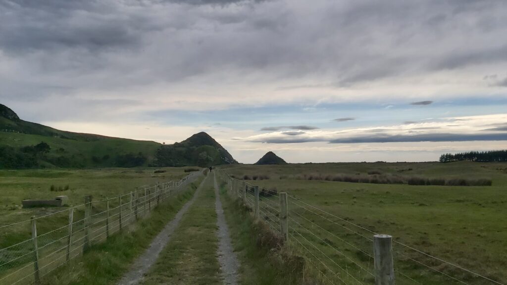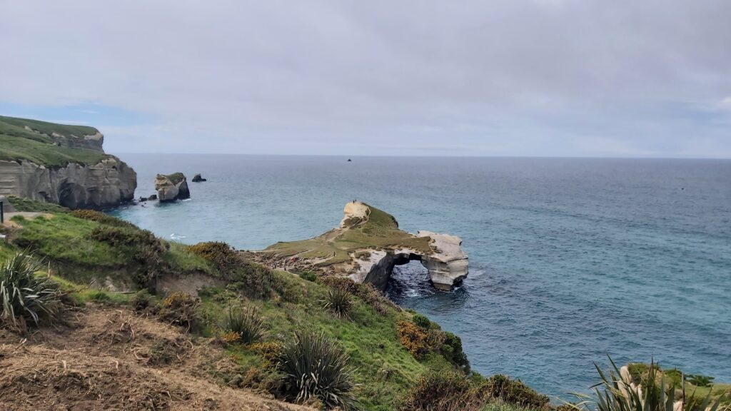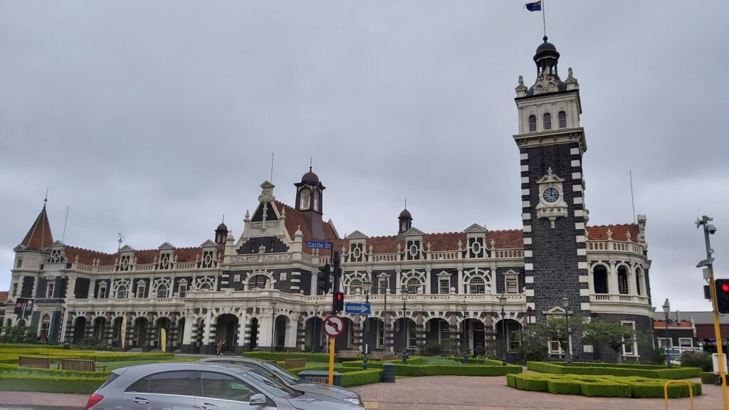 Kopce ve tvaru pyramid. Vlastně to vypadá pěkně z dálky, z blízka to není nic mocZáliv na pobřeží u DunedinuOkolní krajinaTunnel Beach z dálkyTohle je pak pláž z blízkaJá na pobřeží u Tunnel BeachHistorická budova nádraží v Dunedinu