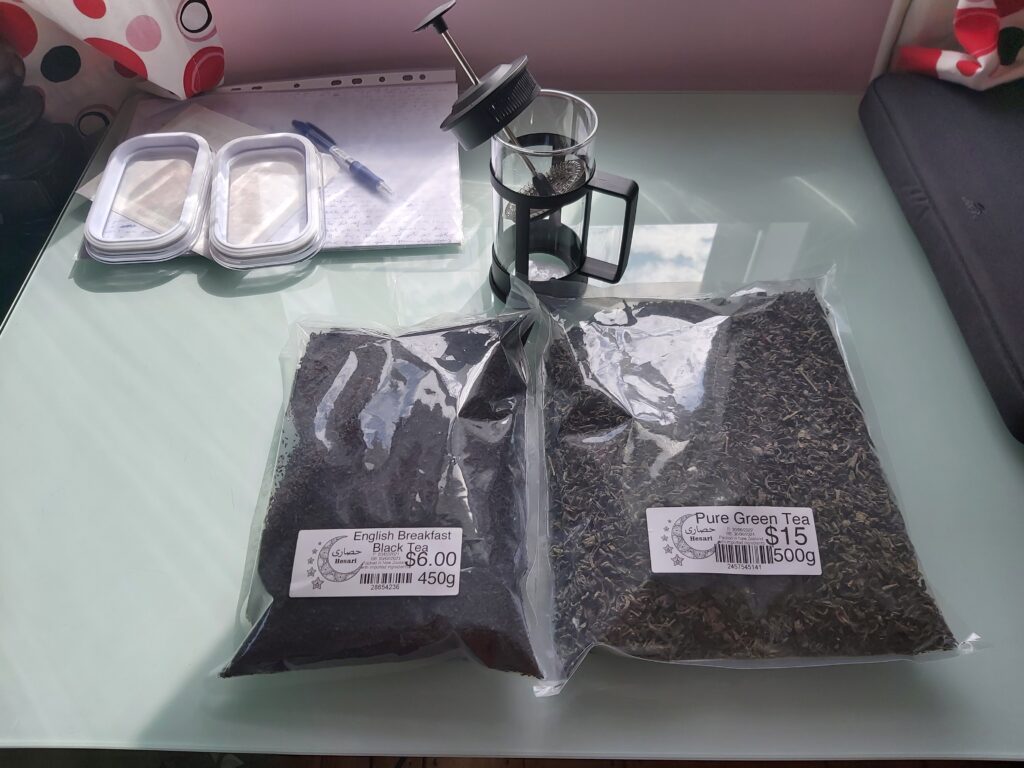 A ještě jeden velice důležitý úspěch dnešního dne, a to že jsem si konečně koupil french press a sypaný čaj. A koukněte na ty balení čaje 😀 . To jsme tady náhodou narazili na obchod jednoho Turka (Hesari supermarket … no je to spíš taková samoška, ale to je jedno) a ten prodává sypaný čaj po velkých baleních. Tedy 450g sypaného English Breakfast čaje stojí 6$ (84 Kč) a 500g zeleného čaje (nepíše jakého ale podle chuti je to asi Gunpowder) stojí 15$ (210 Kč). Dobrý čaj u nás za takovéhoto ceny jen tak nekoupíte.